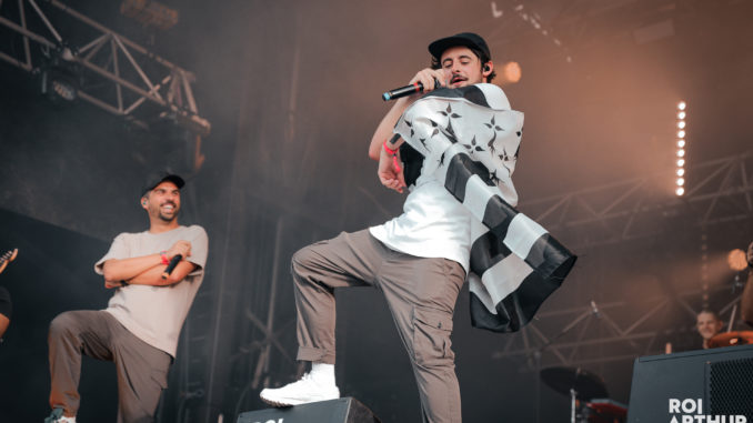 Dès l’ouverture du site, Aziz Sahmaoui & University of Gnawa envoute la plaine. Du rock teinté de musique traditionnelle marocaine, ou peut-être l’inverse, qui accompagne à merveille ce dimanche après-midi ensoleillé.