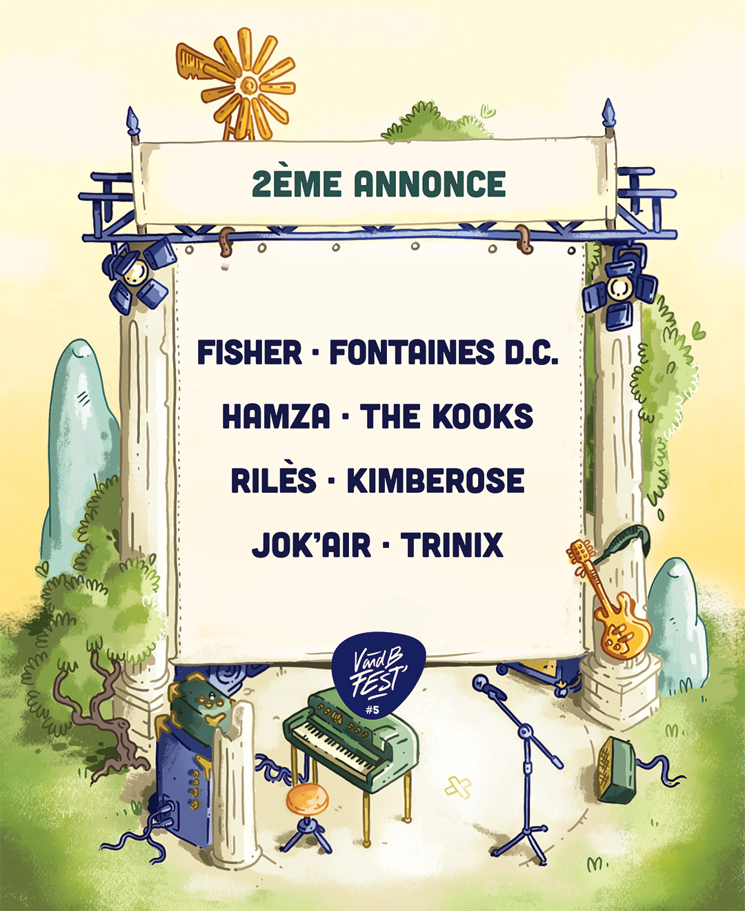 Parmi les nouveaux artistes du festival V and B fest’ qui se déroulera du 21 au 24 août 2025, nous retrouvons le DJ Fisher, les irlandais Fontaines D.C., la star montante du rap Hamza, le groupe britannique The Kooks, Rilès, Jok’Air, et Kimberose, la révélation soul française.